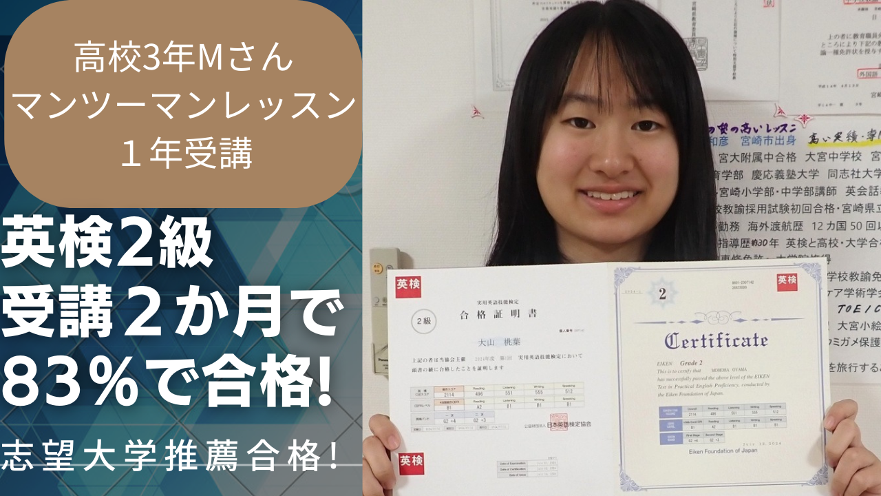 - 英検3カ月の徹底指導で全員初回高得点合格!準1級85%,2級86%,準2級88%,3級92%!